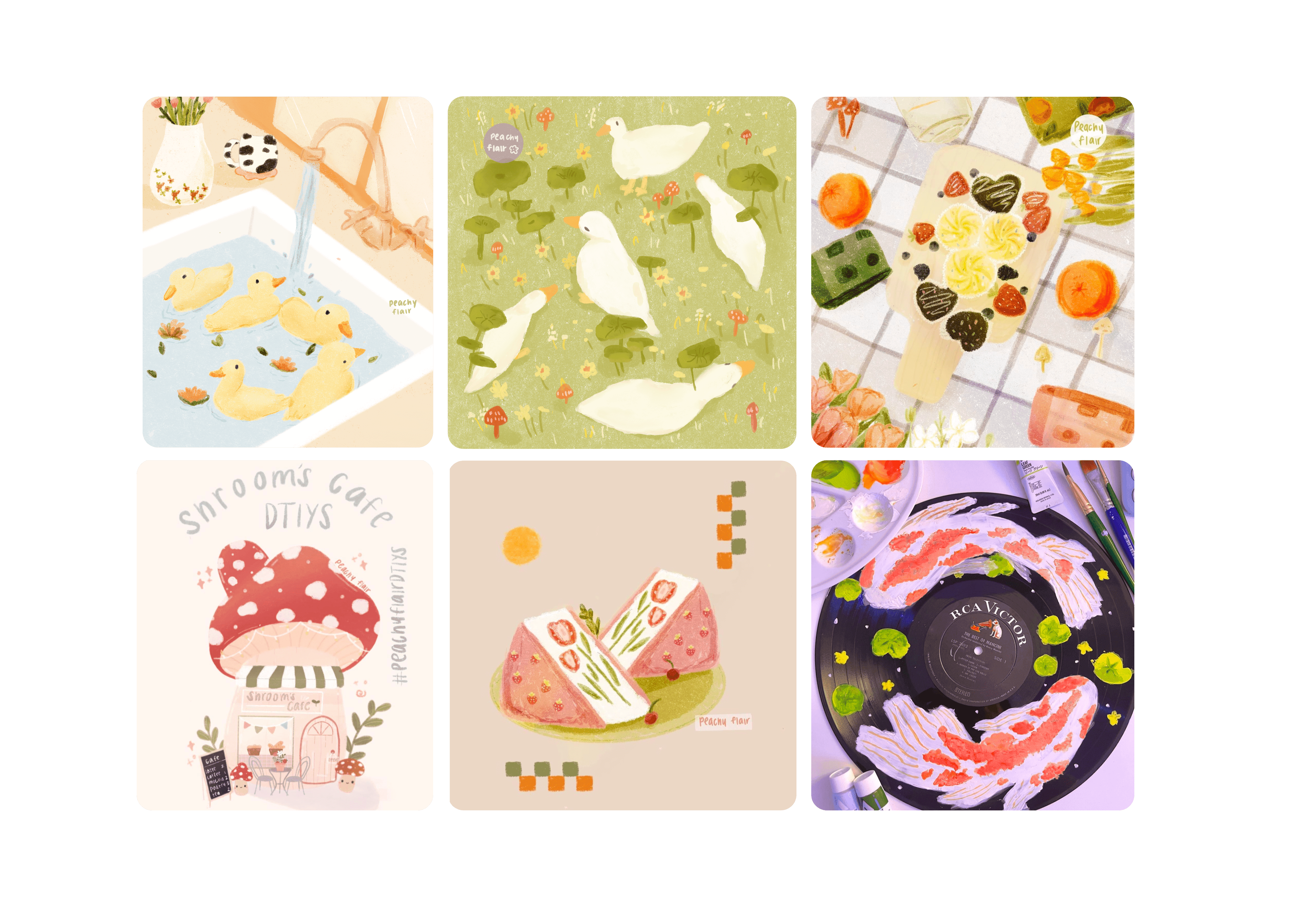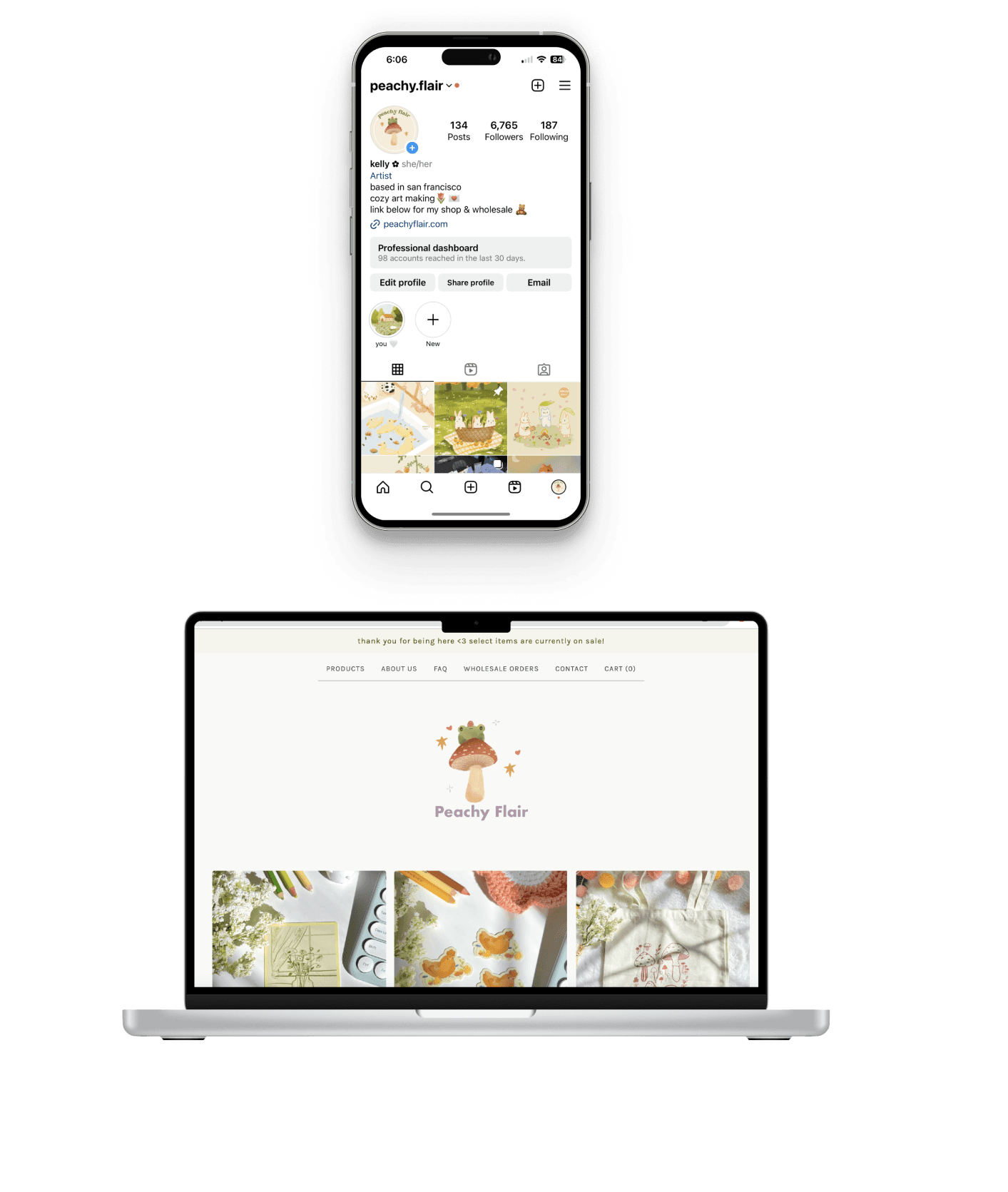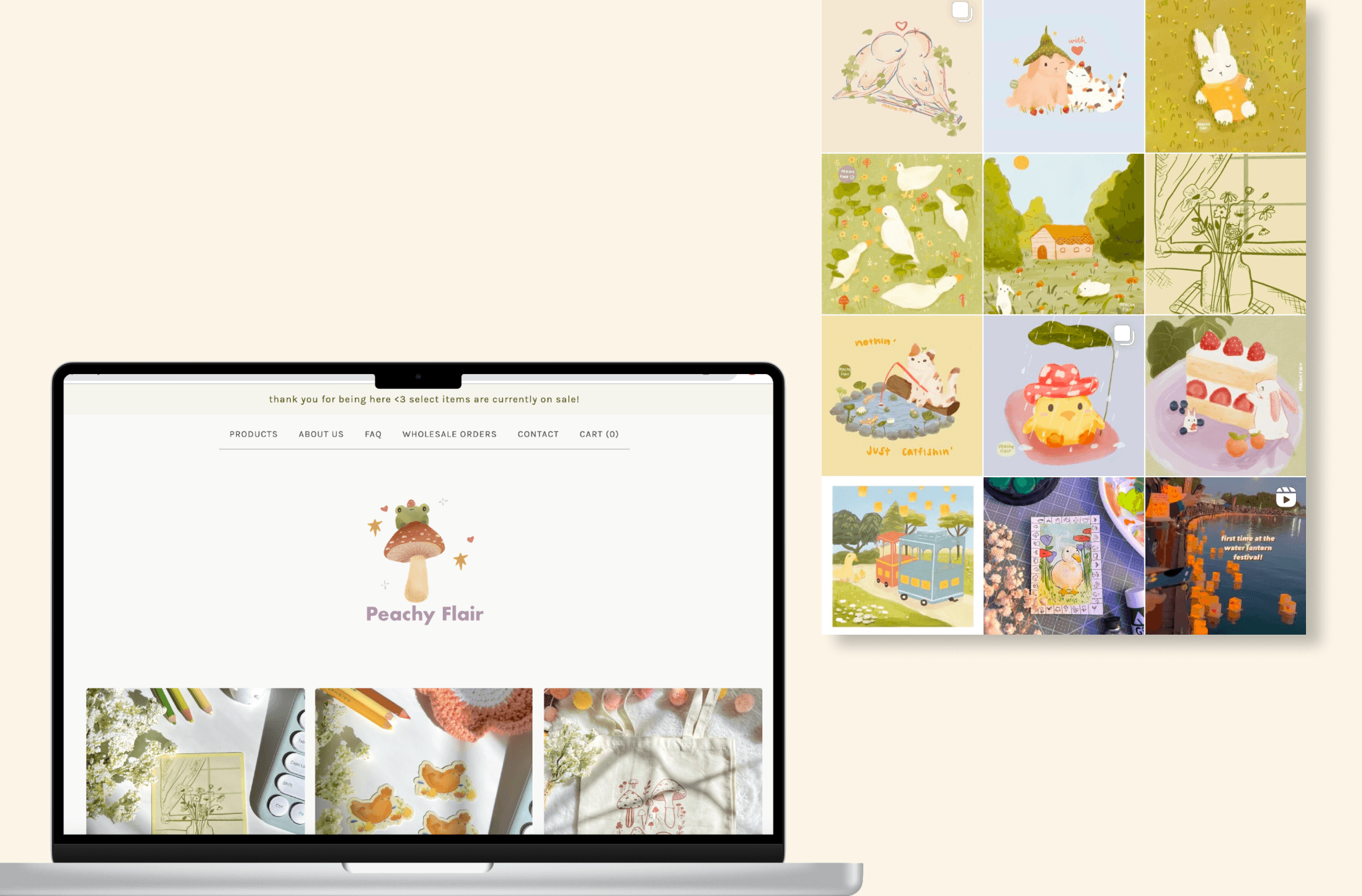 During the pandemic, I started Peachy Flair by doodling and sharing my work online—what began as something small quickly picked up momentum. For three years, I created cozy, feel-good artwork and brought it to life through products, connecting with people both online and at local art markets.