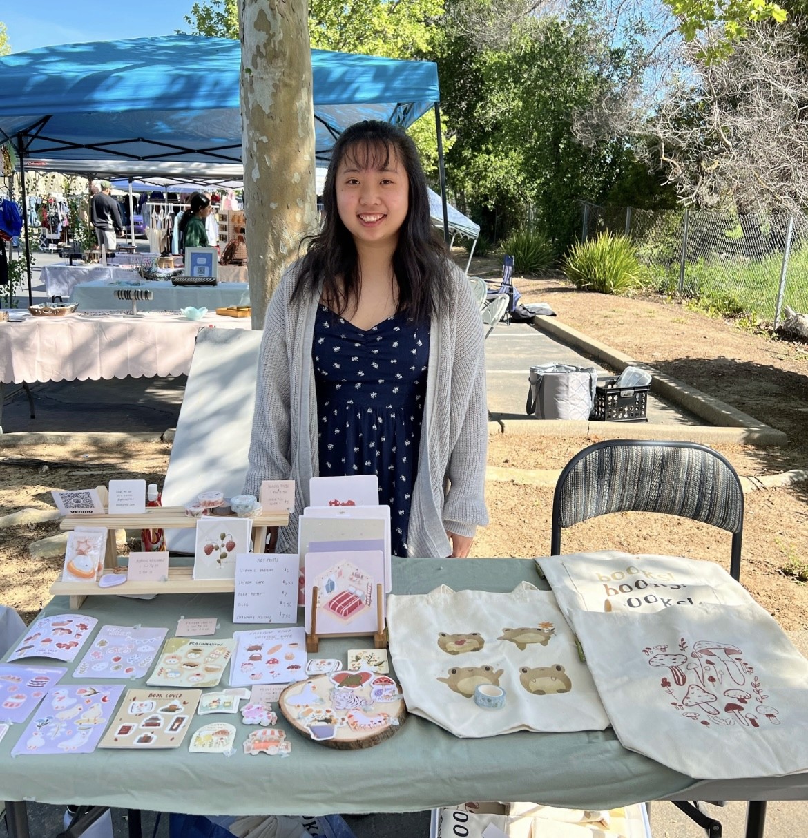 My art market journey first began at the Davis Art Market with a small, wooden TV tray table and a few stickers on display. As my social platform grew, I found myself open to larger spaces like Sac Town's Finest, a market of over 100 vendors. Beyond the $300–1K profit each market brought in, what I treasured most was the genuine connections and interactions formed over shared passion for art.